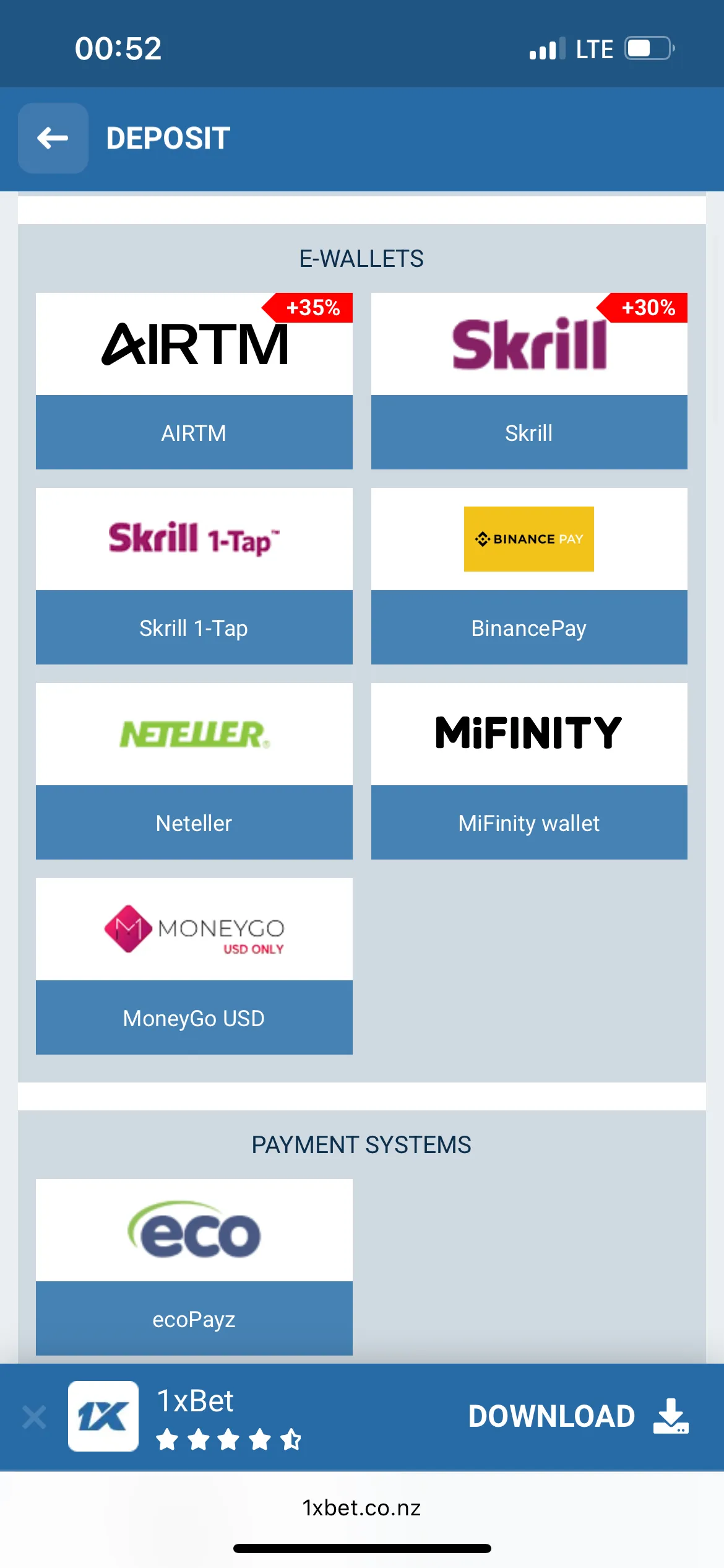 I can’t complain about the choice of deposits and withdrawals. Here 1xBet exceeded my expectations. Among the available options for Kiwi players were:
