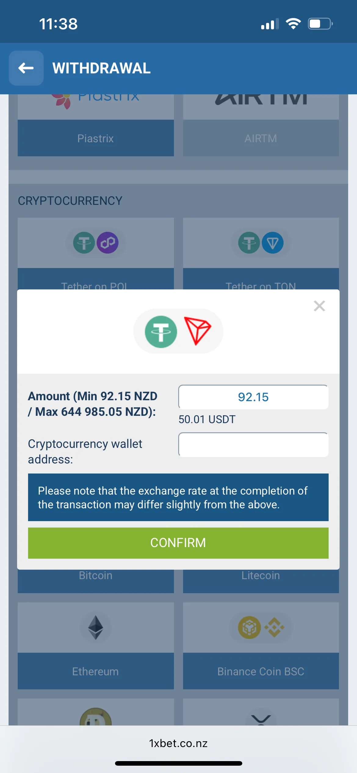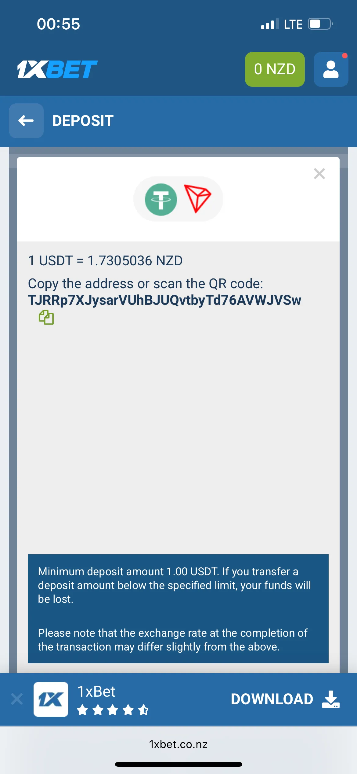 After registration, which is pretty standard, I moved on to deposits. I have already provided all the available payment methods for Kiwis in the table above, and I am going to talk more about payments later in this 1xBet review. So, for me, I chose to deposit 9 USDT via USDT TRC20, plus I paid 1 USDT network fee. The minimum deposit required at 1xBet is 10 USDT.