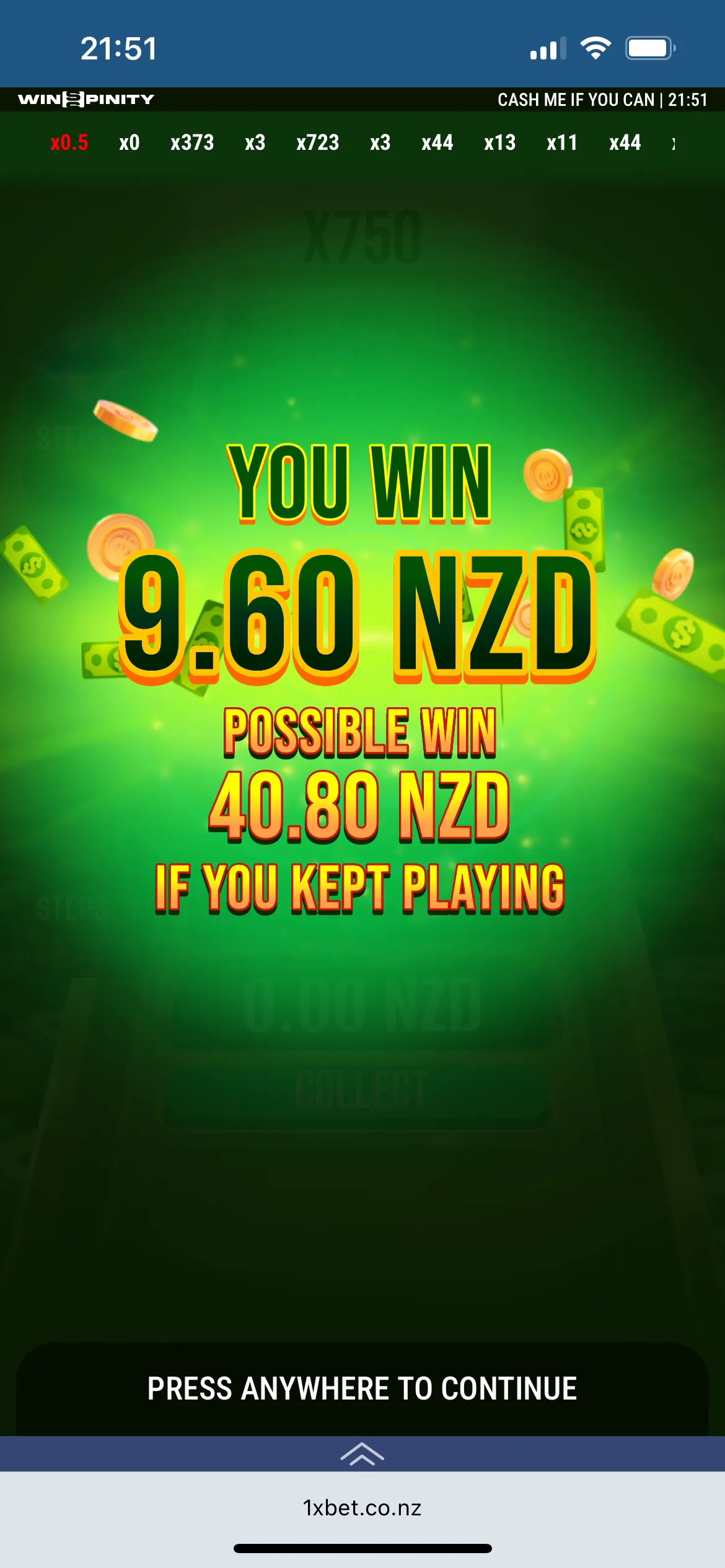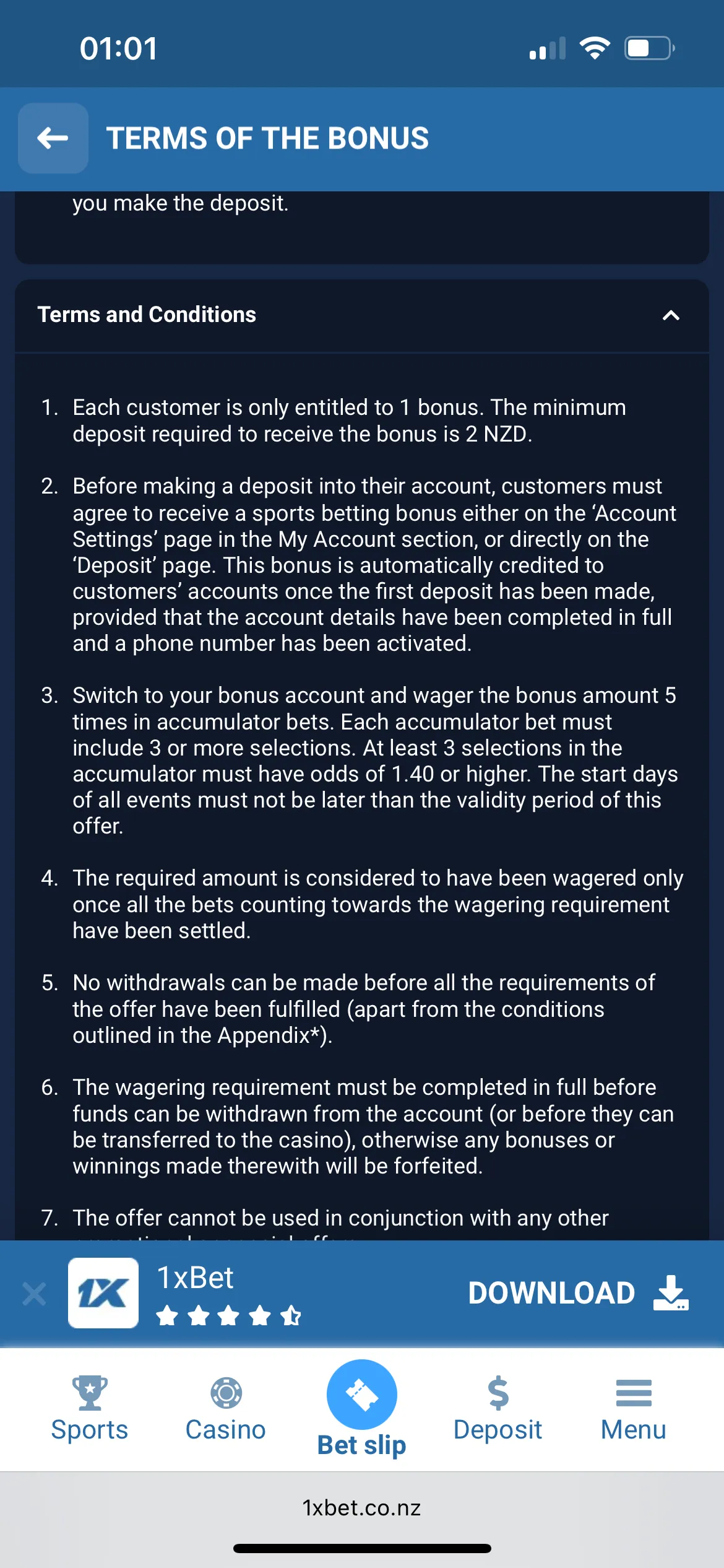 My overall experience wasn’t that great because the design is outdated and the navigation is really messy. It’s quite difficult to find out how to place a wager and bet on sports. As I have already said, I failed to contact customer support. I was excited about the bonus since I needed only 2 NZD in my account, but I faced another obstacle: 1xBet mobile login confirmation was required. I also didn’t win much, even though I played quite a few slot machines. I also couldn’t download the 1xBet app even though it is advertised for iOS and Android on their official website. I also had issues loading slots; it took ages. And finally, the 100 1xBet free spins I was promised by subscribing to the Telegram challenge weren’t available either.