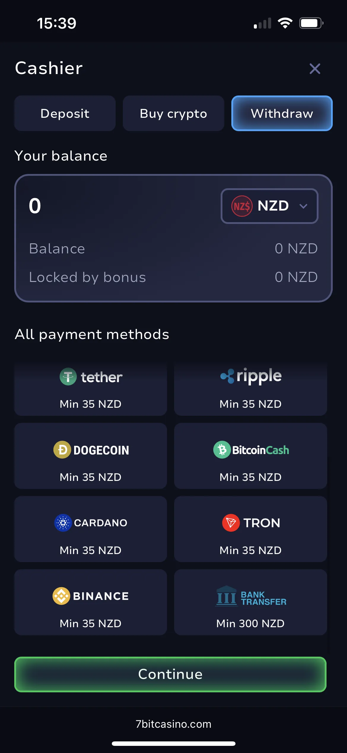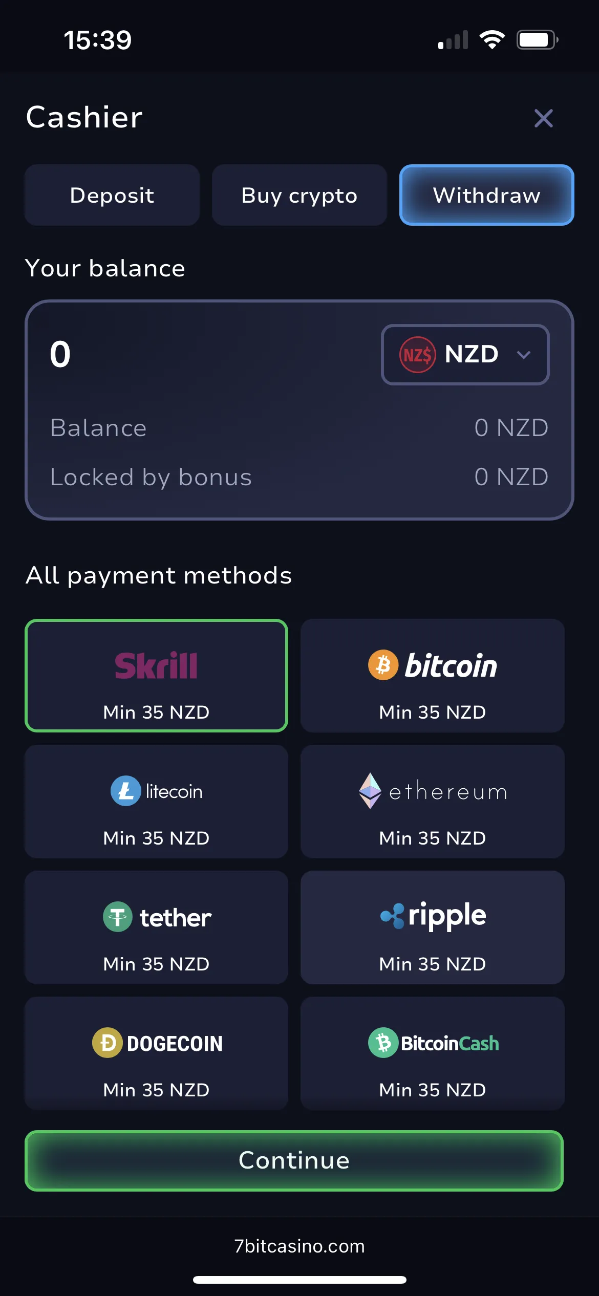Deposits via Visa, Neosurf and PaySafeCard start at just NZD 1, while all other methods—Skrill, Neteller, Flexepin, and the remaining crypto rails—require higher minimum deposits. Withdrawals return to the same rail—and the same crypto address—within a day of verification. My BTC payout went to the blockchain in 45 minutes; a later Skrill withdrawal landed the same day. All transactions are SSL‑secured, and two‑factor toggles under Security give you a second PIN at every 7Bit Casino login.