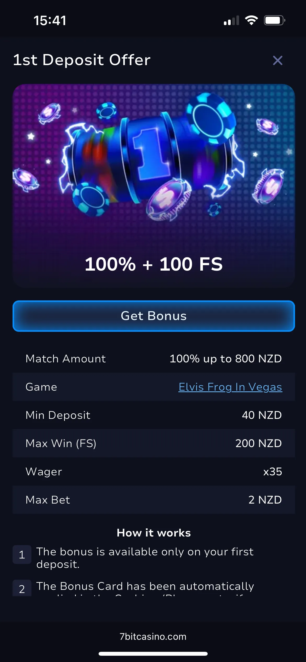 The headline promoter is a 100 % match to 800 NZD with 100 7Bit Casino free spins to Elvis Frog in Vegas. Min deposit is 40 NZD, but the actual floor of the website is NZD 1; that sounds almost like a 7Bit Casino no deposit bonus compared to most competitors—useful when you’re just testing volatility with micro wagers. Activation within the in-game bonus shop, My Bonuses, sees in-game money first, with bonus money going for a spin thereafter with a 35× bet and top bet maximum of 2 NZD.