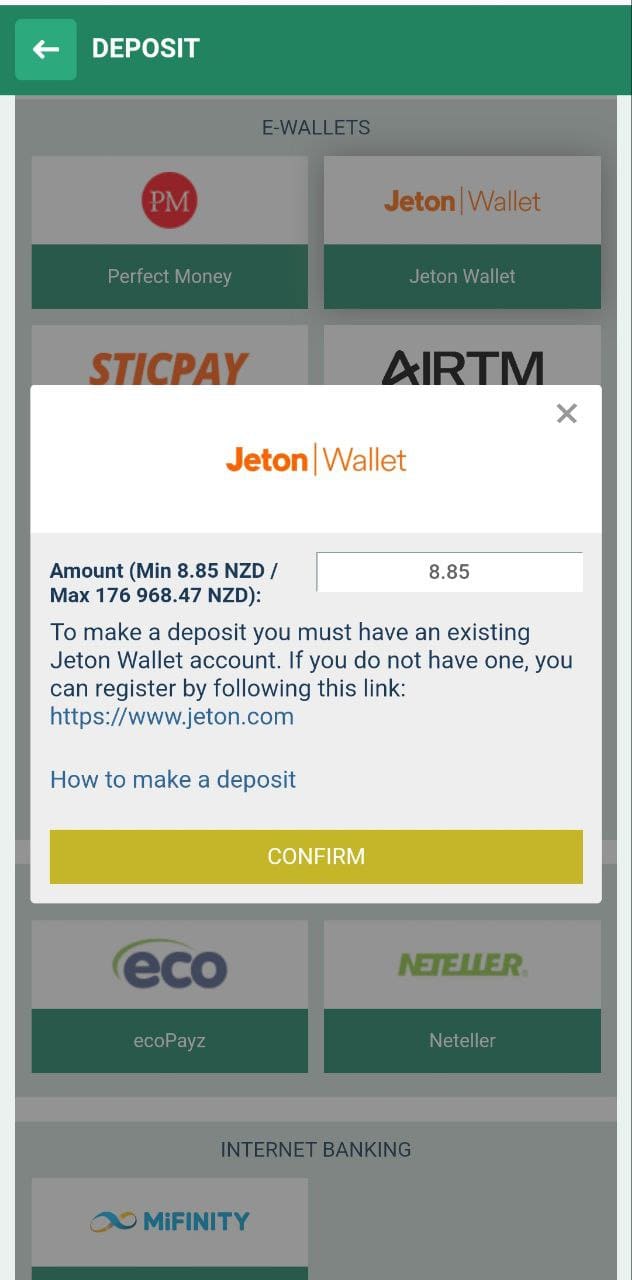 The minimum deposit amount was really low, as you can see on the screenshots, 8.85 NZD, which is the exact conversion of 5 EUR. After you enter the desired deposit amount, you’re taken to the Jeton website to complete the payment.