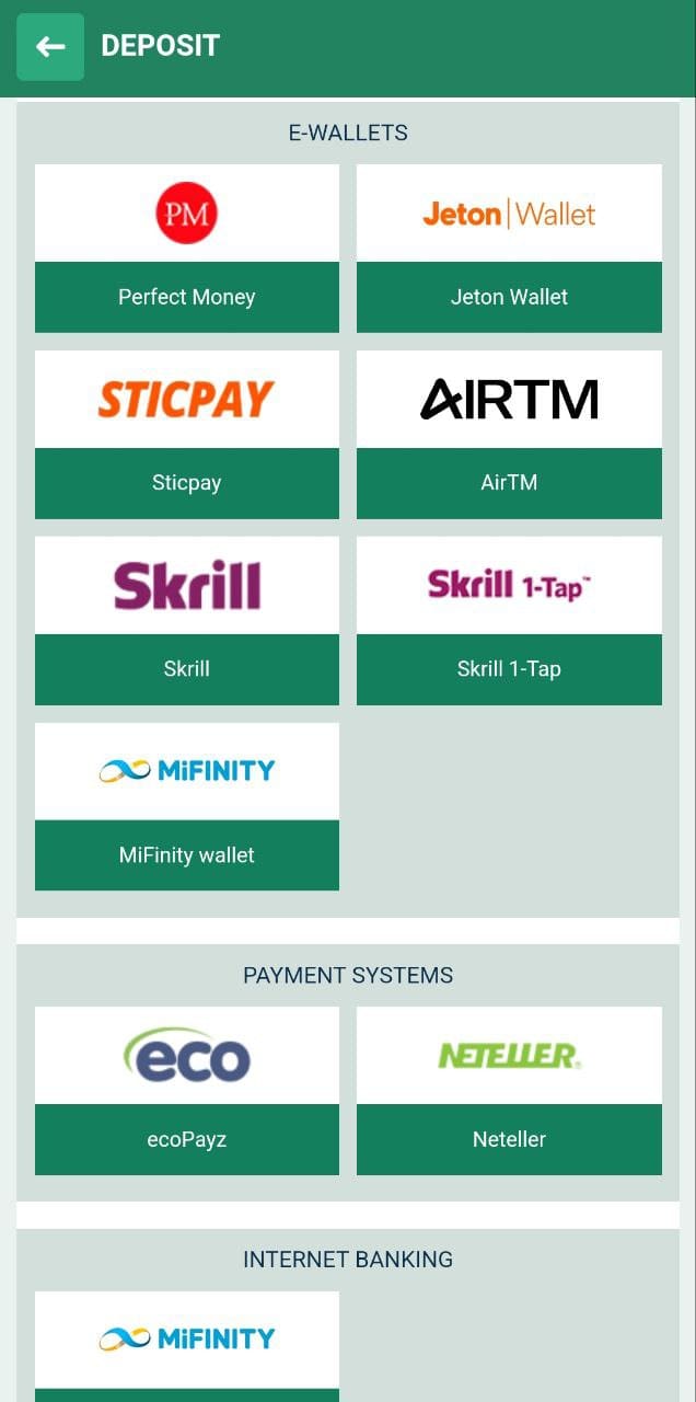 | Deposit options: | Visa, Mastercard, Perfect Money, Jeton, Sticpay, AirTM, Skrill, Skrill 1-Tap, MiFinity, ecoPayz, Neteller, Paysafecard, and 43 cryptocurrencies |