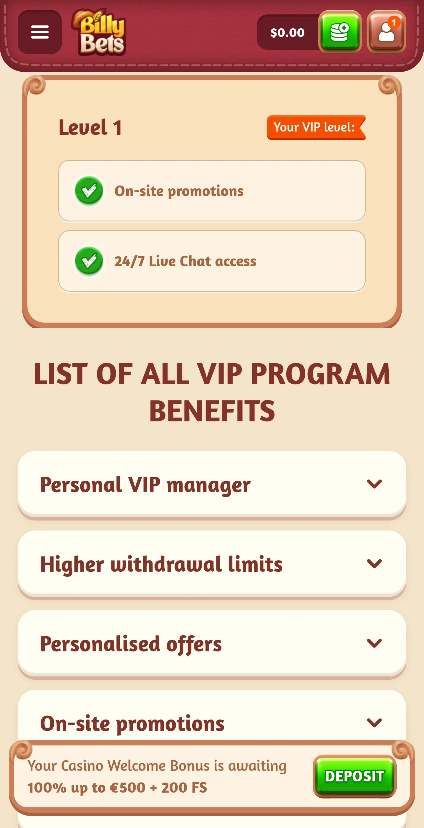 Unfortunately, from the “VIP” page, I couldn’t find much specific information, and BillyBets keeps things a little vague. I suspect it works like pretty much every loyalty programme out there, however, as I can see “Level 1” at the top of the screen, and could browse up to Level 5 – so it’s a points-based system, at least.