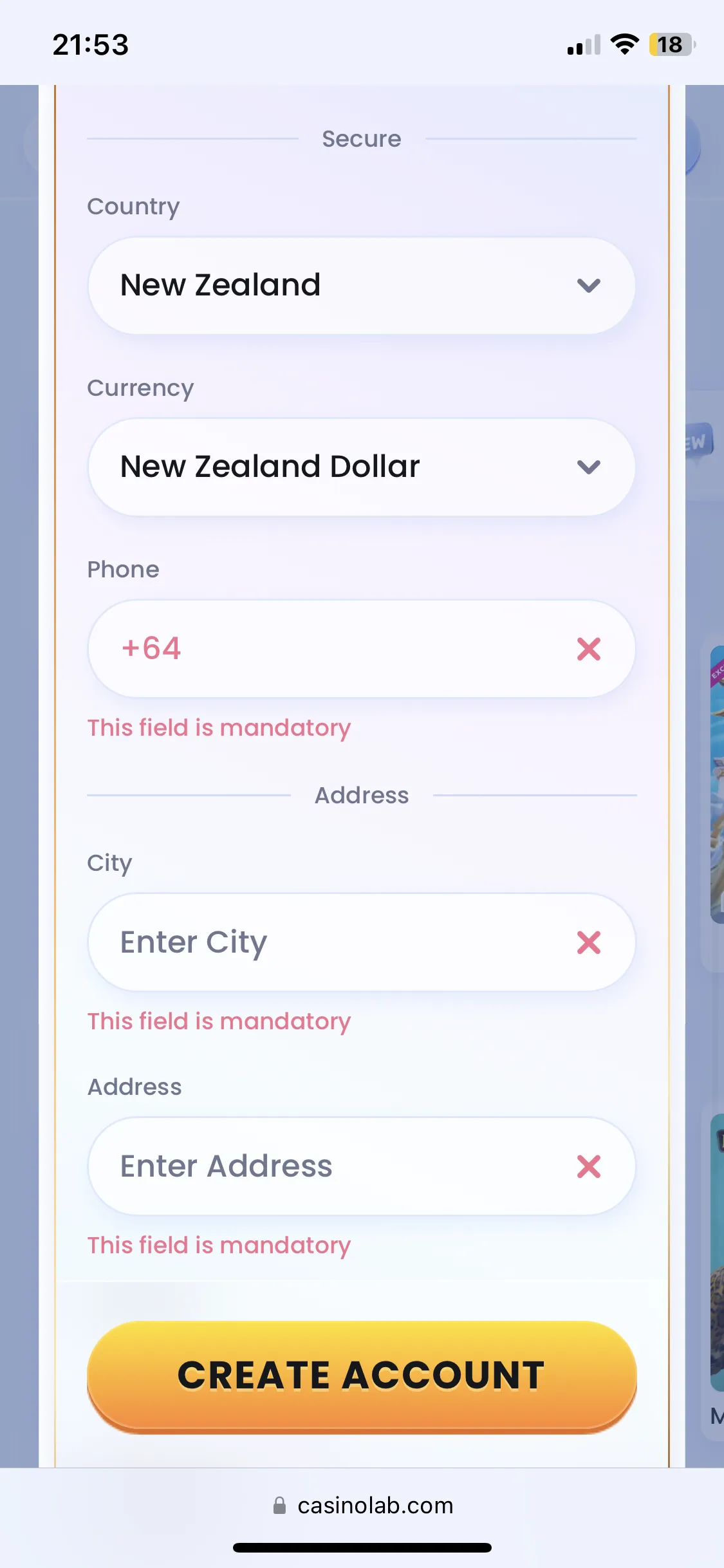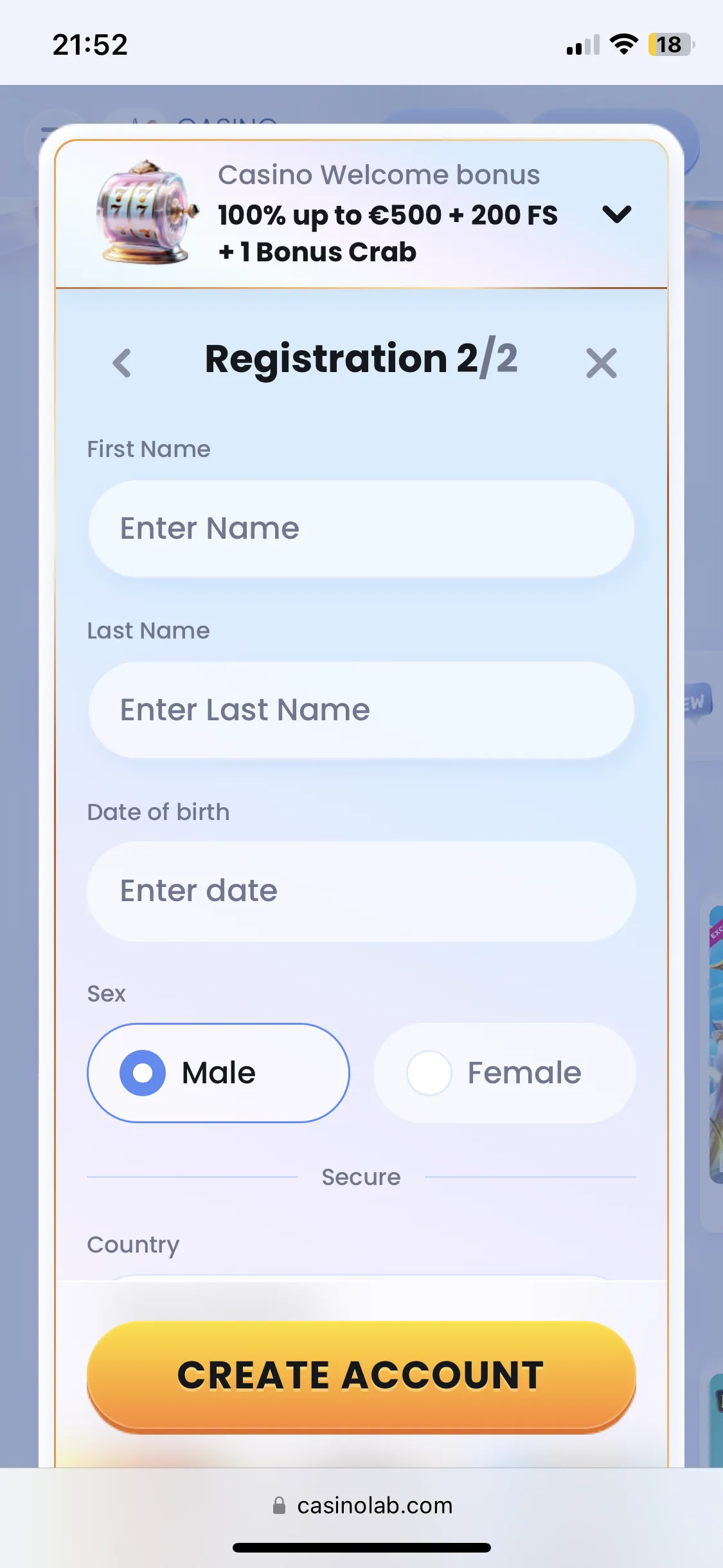 To finalize the registration click Create an account. Proceed to your email and find a letter from Casino Lab. You will be required to click the link in order to confirm your email and use your account without restrictions.