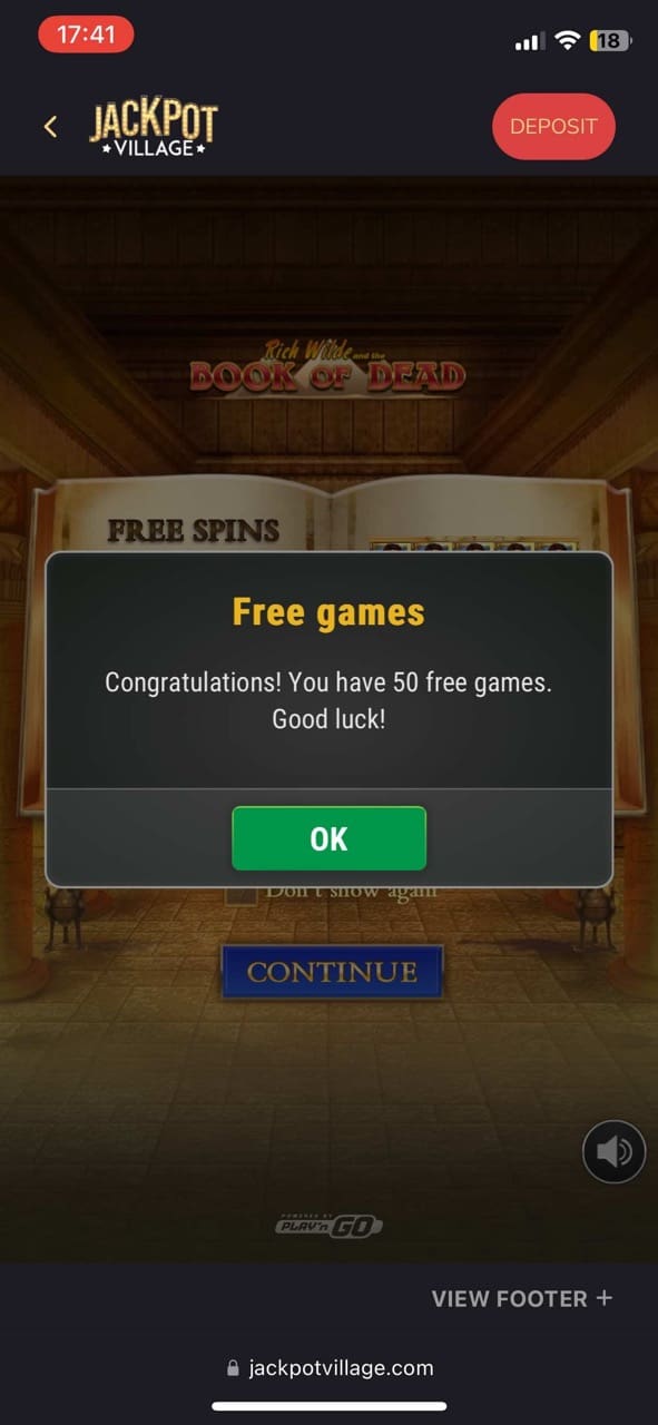 I activated the first deposit bonus, which is beaut. Jackpot Village gives a 200% bonus up to 500 NZD + 500 loyalty points + 50 free spins on the Rich Wilde and the Book of Dead pokies upon the first deposit. So, making a deposit of 20 NZD, I got +40 NZD in my account.