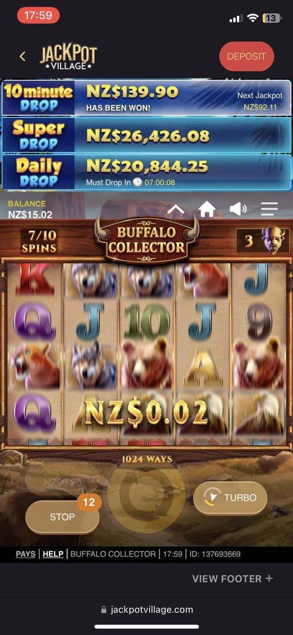 Another promo I decided to test was Bonus Wheel. Jackpot Village gives every player a chance to spin a Bonus Wheel one time a day. Spinning the Wheel, I managed to get free spins upon my next deposits, but once I won 5 NZD on my bonus account, I decided to play Jackpot: Buffalo Collector. Quite a cool game.