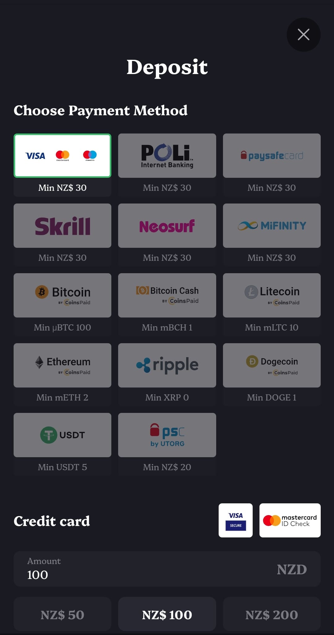 | Minimum deposit: | NZD30 |