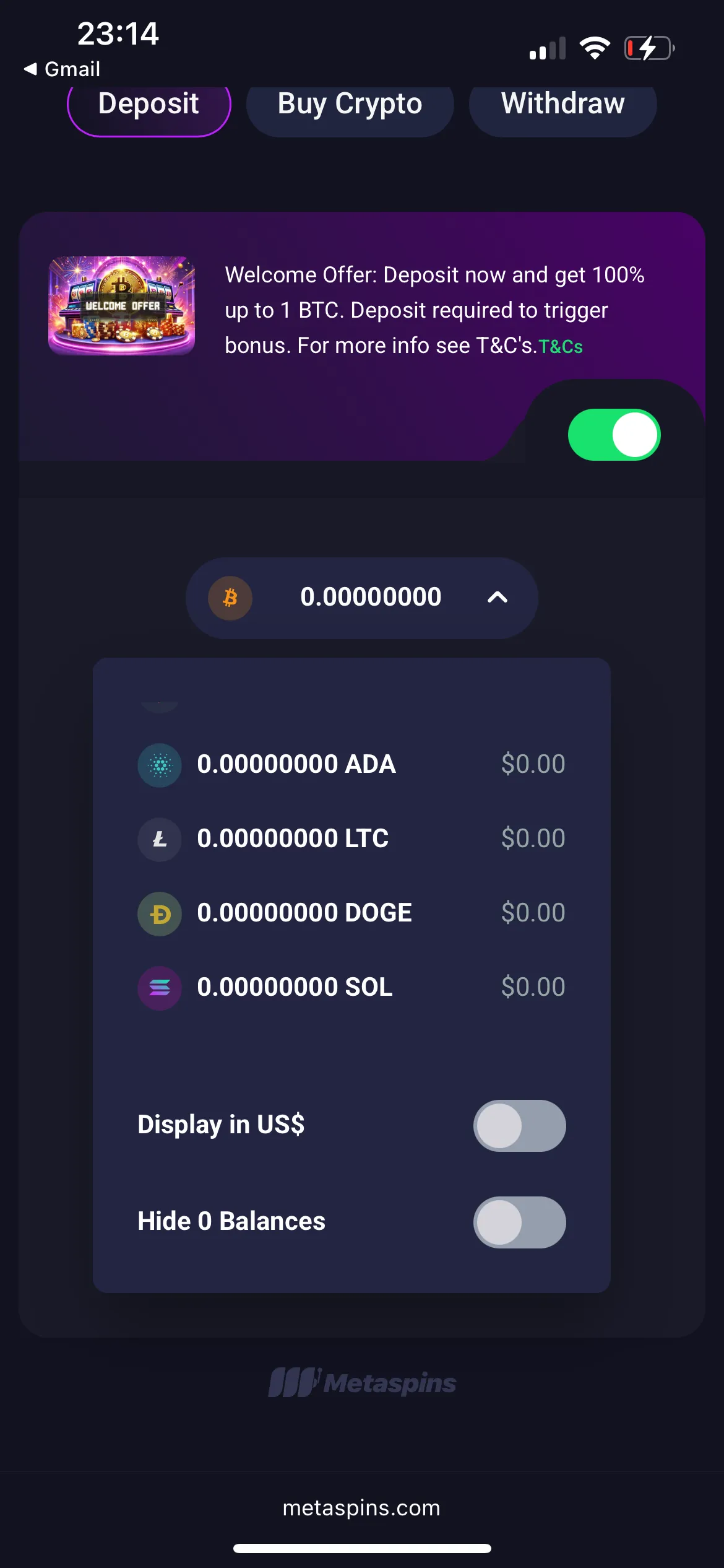 So, as I have already said, Metaspins is a fully crypto casino. The Metaspins NZ login procedure was super fast due to being a cryptocurrency casino. I didn’t have to add my address, choose gender, add phone number and other contact info. Only email and password were required. Once I confirmed my email, I went straight to the Cashier page.