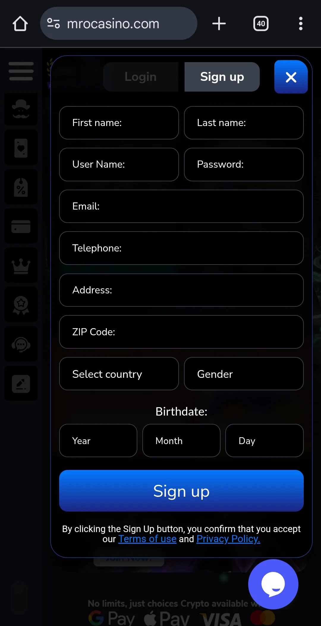 Unfortunately, when it comes to withdrawals, Mr O only supports crypto – so even though you can deposit using Credit and Debit Cards, you’re not able to withdraw using them.