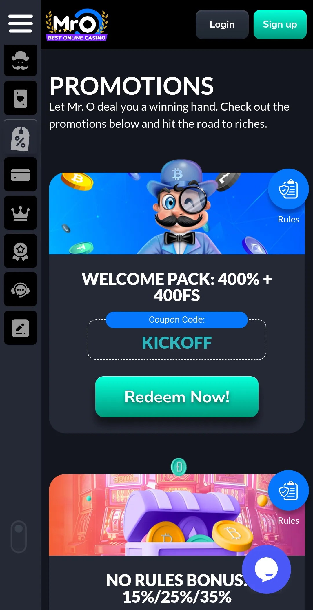 Mr O runs a variety of ongoing offers. These include “No Rules Bonuses”, which is usually cashback up to $200, with wagering requirements of just 1x, weekly reloads, and free spins promotions.