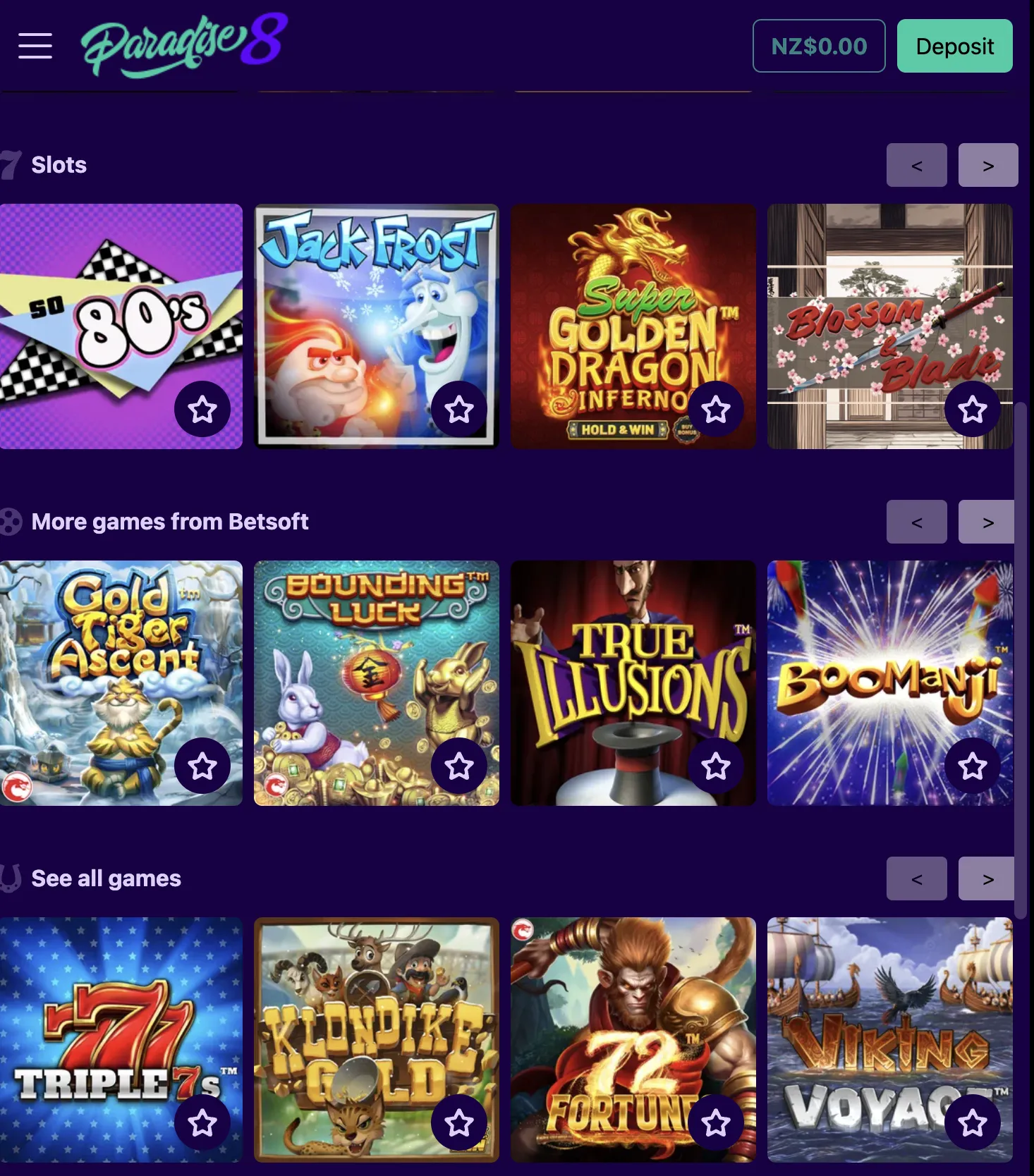 Paradise 8 Casino doesn’t have a dedicated jackpots tab – although some of its pokies do contain jackpots – most notably those from Betsoft. In these progressive jackpot games, the jackpots are awarded randomly – although playing at higher stakes does increase your chances of winning them.