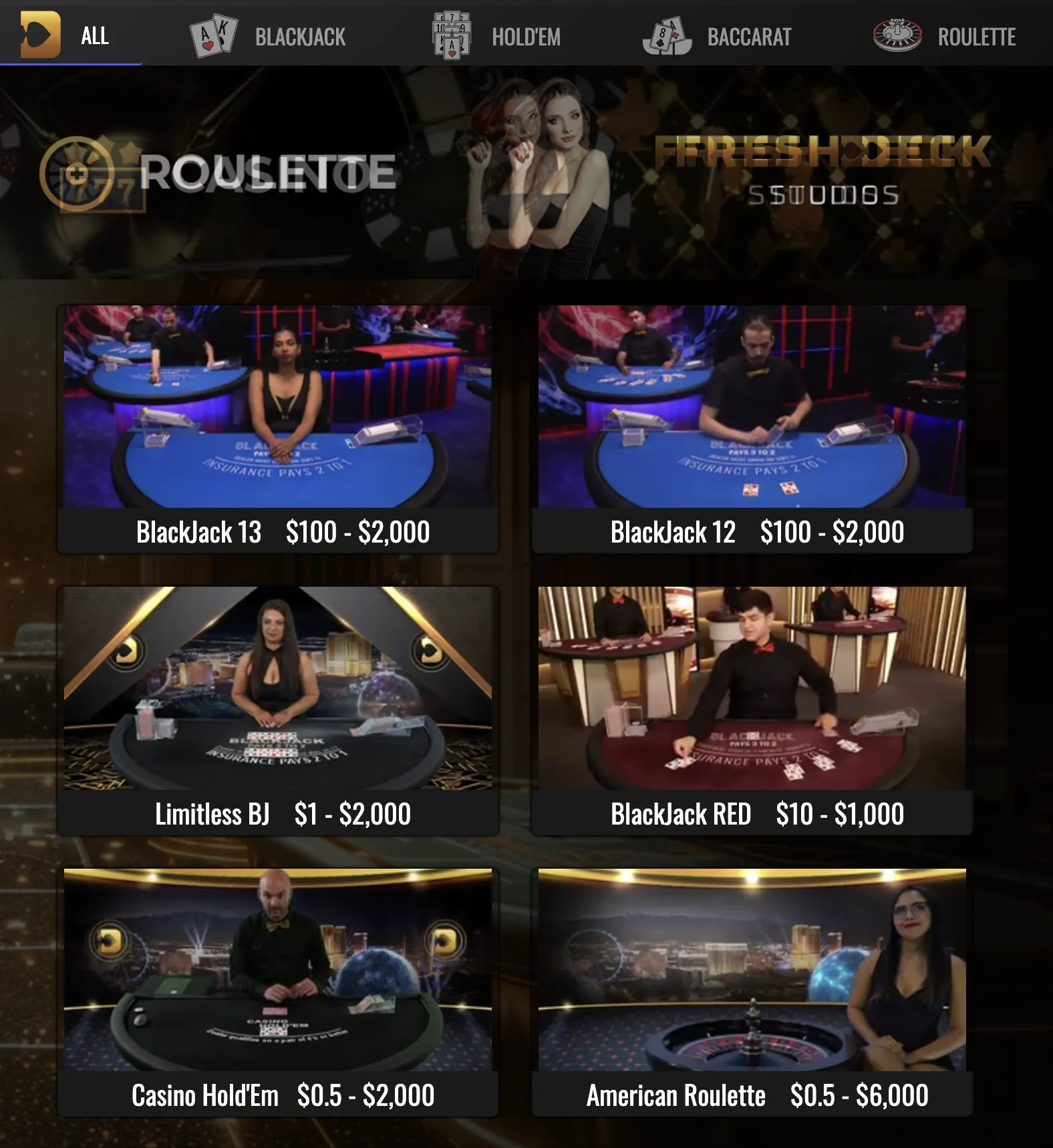 Paradise 8 has a live dealer casino, although it looks very old. Depending on which country you’re playing from, the software provider will change; when I wrote this casino review, the live dealer casino was powered by Fresh Deck Studios. You have to load the game developer’s lobby in a new window, and you will then see which games are available.