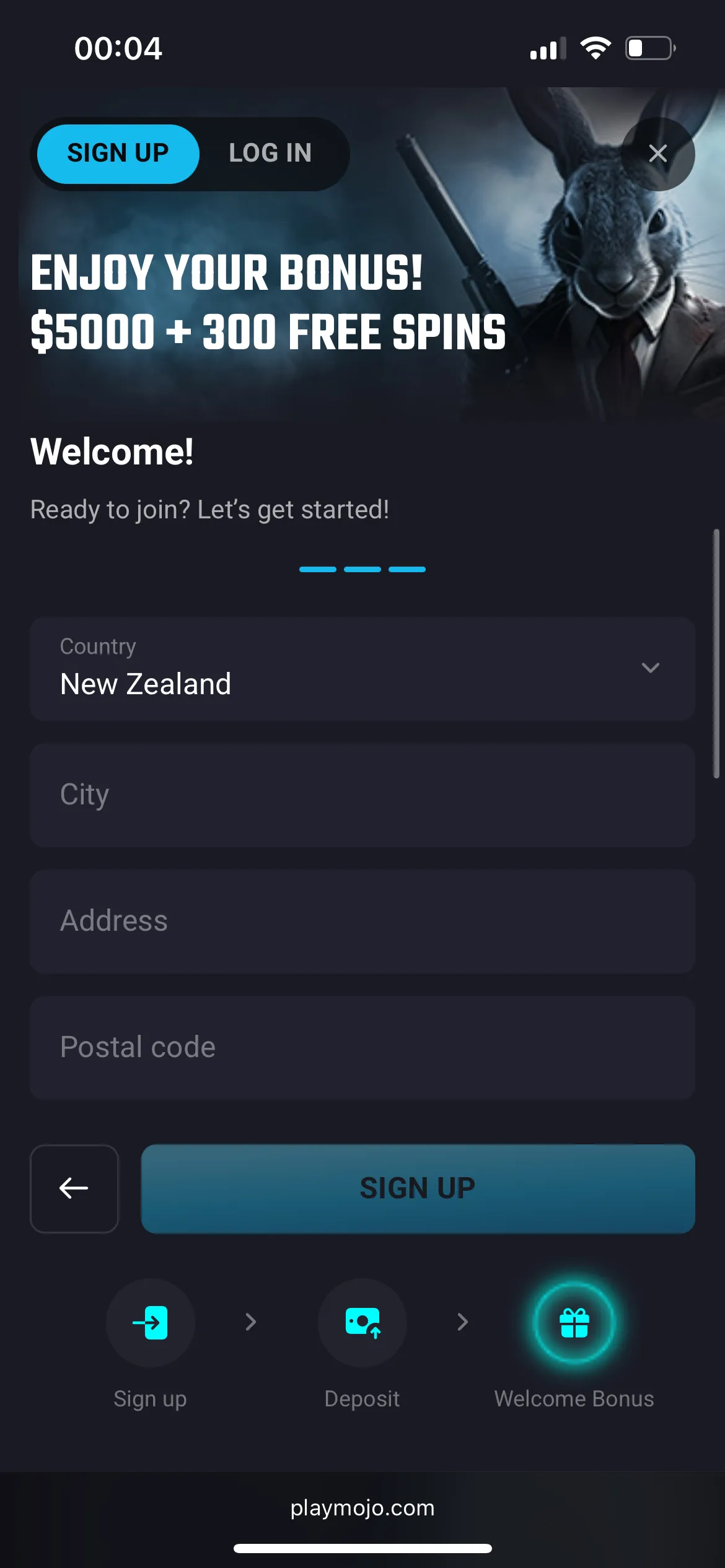 In order to claim a welcome bonus, play pokies for real money and get loyalty rewards, you must create a PlayMojo login. You should easily locate a blue Sign Up button at the upper right-hand corner of the official site. Click it and provide this information: