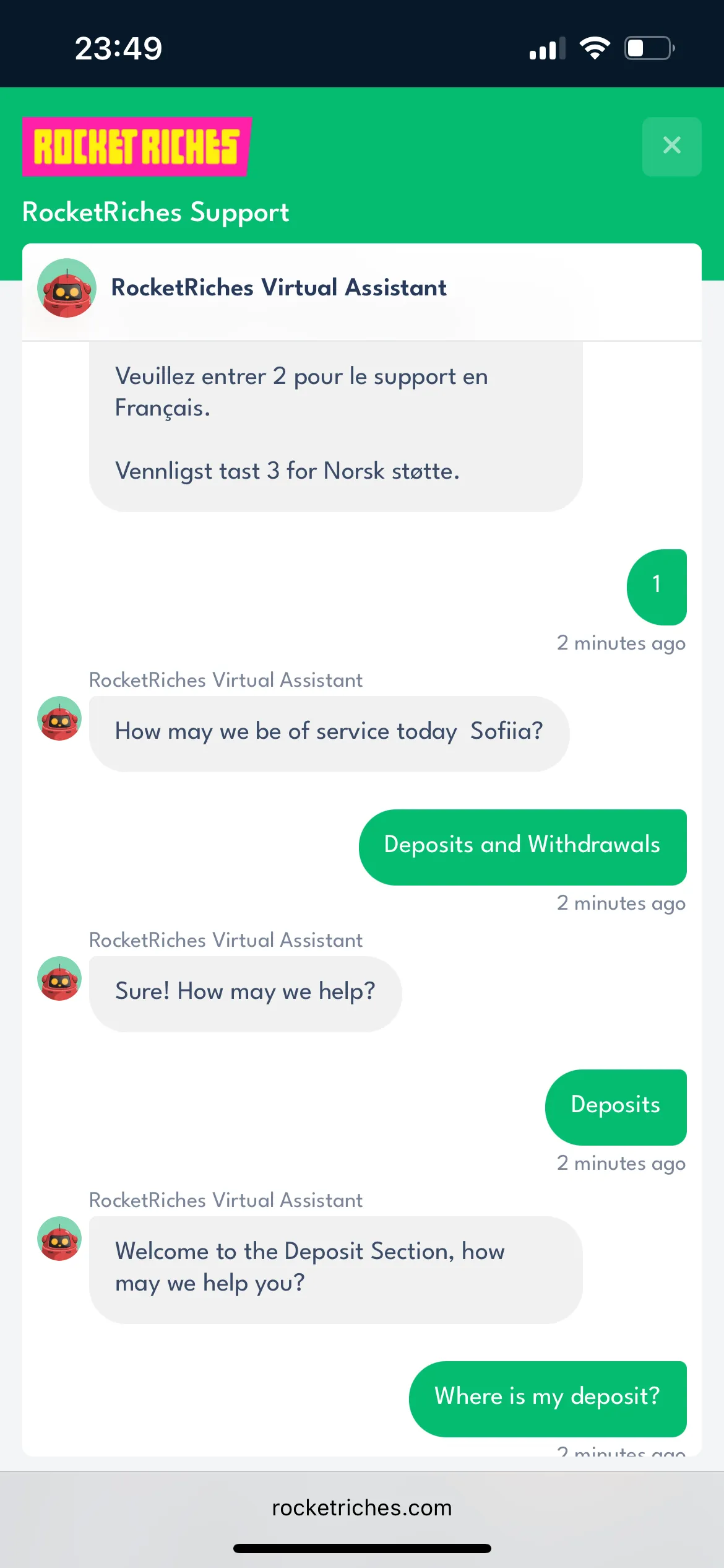 To reach the customer support, players need to hit the top right navigation tab and then hit the help tab. You will then find a comprehensive help section which includes assistance regarding accounts, deposits, games/casino, withdrawals, bonuses, top questions, account verification, registration, general and more. Once you open a question, there is the option for further help, which comes through live chat with a chatbot around the clock. You can also reach out for assistance via email at [email protected].