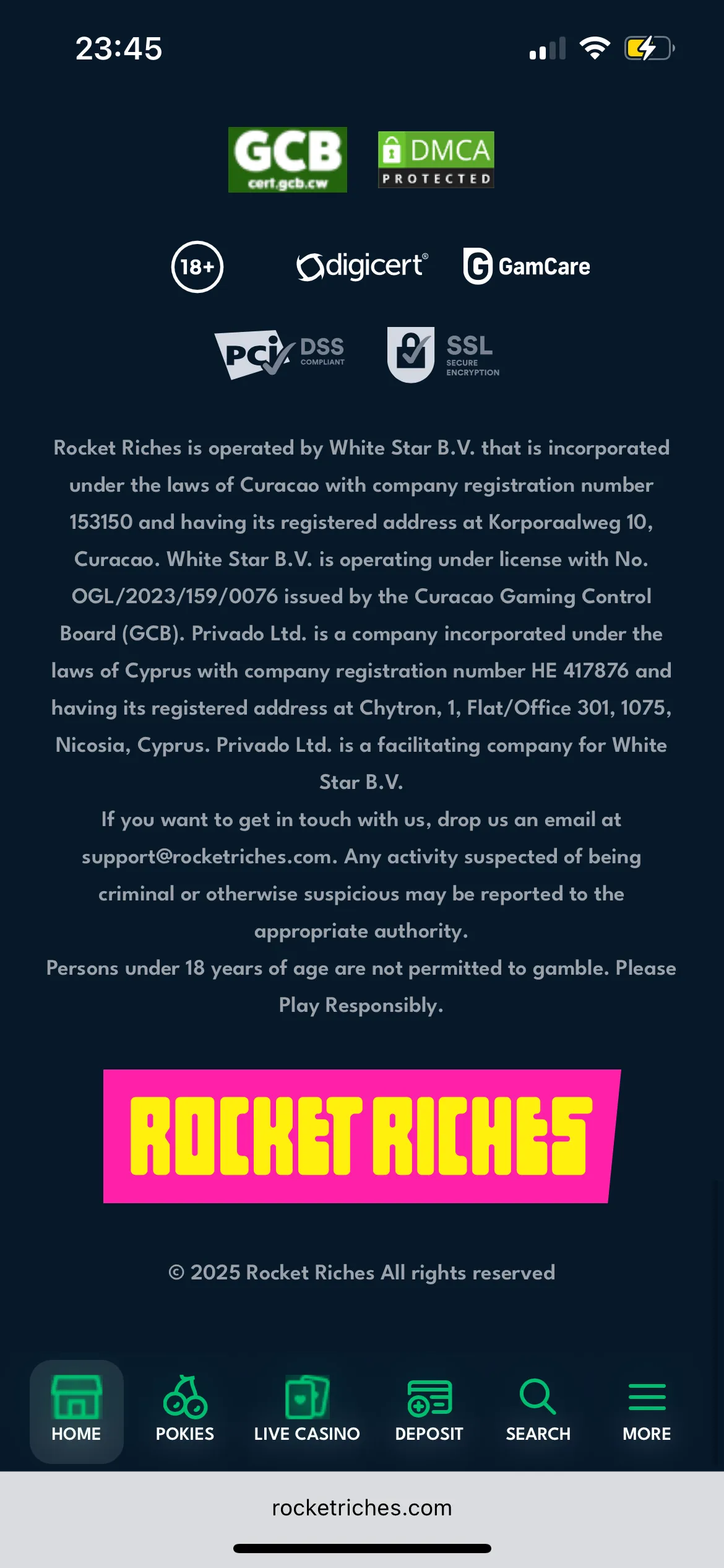 Rocket Riches online casino holds a Curacao gambling licence.